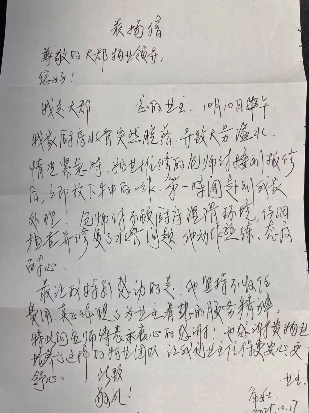 从紧急报修到暖心致谢 —新程红色物业用行动诠释“业主至上” 10月10日中午,新程物业仙霞大郡小区业主布女士家中突发紧急状况——厨房水管意外脱落,大量积水瞬间涌出,心里焦急万分,布女士第一时间联系了小区物业管理处寻求帮助。 接到报修后,维修师傅鲍锡华毫不犹豫放下手头工作,以最快速度赶赴居民家中。面对满地积水,他立刻蹲身排查问题,凭借多年积累的专业经验和娴熟技术,迅速定位水管脱落原因,有条不紊地开展维修作业。维修过程中,鲍师傅没有只顾着埋头干活,还耐心地向布女士讲解故障根源,细致叮嘱后续日常使用中需要注意的养护细节。通俗易懂的解释、认真负责的态度,一点点抚平了布女士焦急的情绪,也让她对物业工作多了一份理解与认可。 维修工作结束后,布女士对鲍师傅的高效服务连连致谢,而鲍师傅只是笑着表示:“这是我们物业人该做的,保障业主正常生活,本来就是我们的责任。”一句朴实的话,却尽显红色物业“为民服务”的初心。 事后,布女士特意手写表扬信送到新程物业,信中满是感动:“鲍师傅的服务让我真切感受到‘业主至上’不是一句口号,新程物业培养出这样的好员工,让我们住得既安心又舒心!”她还特别提到,正是这样事事为业主着想的物业团队,才让小区充满了家的温暖。 这暖心的一幕,并非偶然。作为践行“红色物业”理念的服务团队,新程物业始终将“业主至上,服务第一”刻在工作准则里,无论是日常设施巡检维护,还是突发故障应急处理,物业工作人员总能快速响应、冲锋在前。他们用“分内事不推诿、服务中不敷衍”的实际行动,把为民服务的宗旨落到每一件小事上,也赢得了业主们的一致好评。 未来,新程物业将继续以红色物业建设为引领,不断提升服务水平、强化责任担当,用更贴心、更高效的服务守护业主的幸福生活,让“为民服务”的初心在每一次服务中持续发光发热。 瑞创物业尚品都汇 高效解忧获赠锦旗,专业服务赢得客户赞誉 光荣电子工业(苏州)有限公司,作为临空园区引进的优质日本企业,今年9月遭遇突发办公区域漏水问题——漏水不仅影响其自身办公,还波及楼下企业,严重干扰两家日常运营。 接到反馈后,尚品都汇物业管理处迅速响应,立即启动水浸事件应急预案。客服部与工程部人员第一时间抵达现场开展抢修,一边高效堵截漏水源头、阻止渗漏扩散,一边在楼下办公区摆放水桶等防汛工具,最大限度降低双方财产损失。 抢修结束后,物业工程部并未止步,主动协助光荣电子的施工单位研讨漏水修复方案,后续还定期上门查验施工进度与质量,确保问题彻底解决、不再复发。同时,物业额外组织楼上楼下企业召开沟通协调会,有效化解潜在矛盾,进一步改善了企业间的邻里关系。 为感谢尚品都汇物业全程专业、负责的服务,光荣电子特地赠送锦旗,以表认可与谢意。