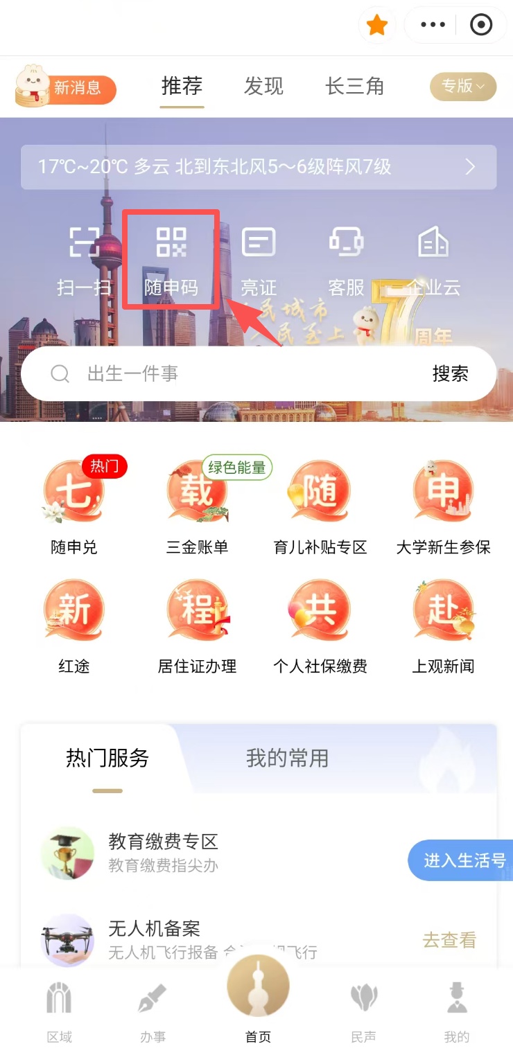打开“随申办市民云”(APP/微信小程序/支付宝小程序),首页点击“随申码”,开通交通场景配置,完成签约,即可使用。全市地铁、公交、轮渡“一码通行”。