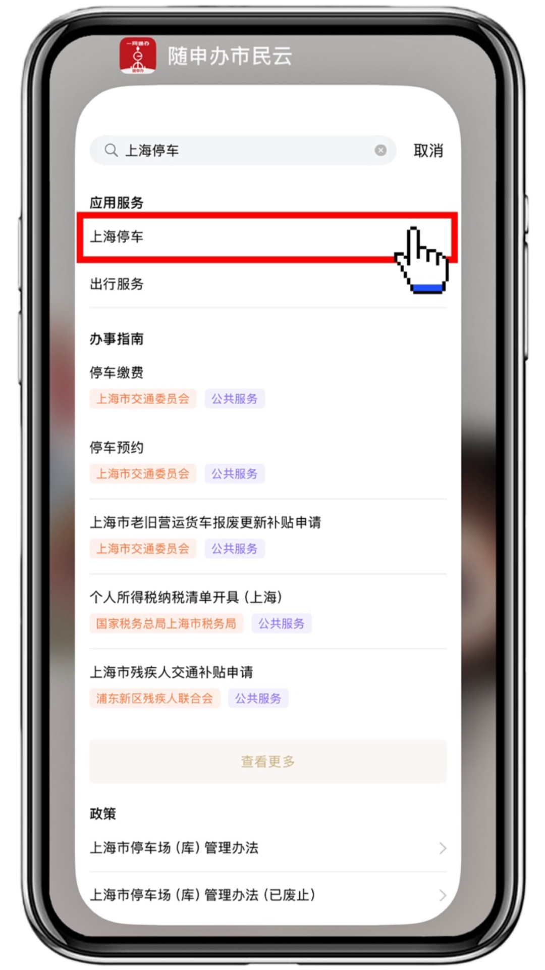 打开“随申办市民云”APP,首页搜索栏输入“上海停车”,并点击进入。