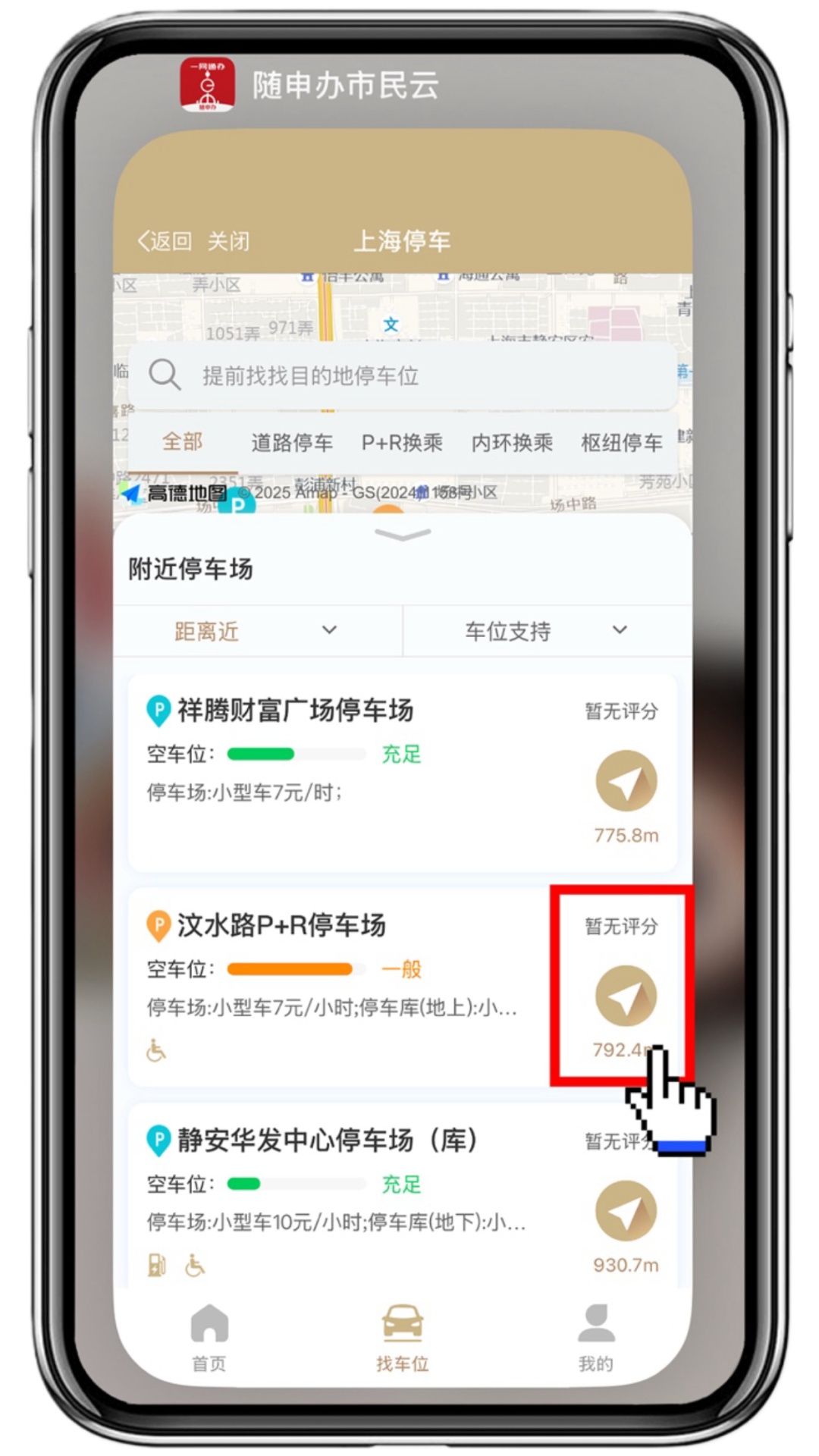 选就近:“距离近”或“空位多”任选,筛选符合您自身要求的停车场。