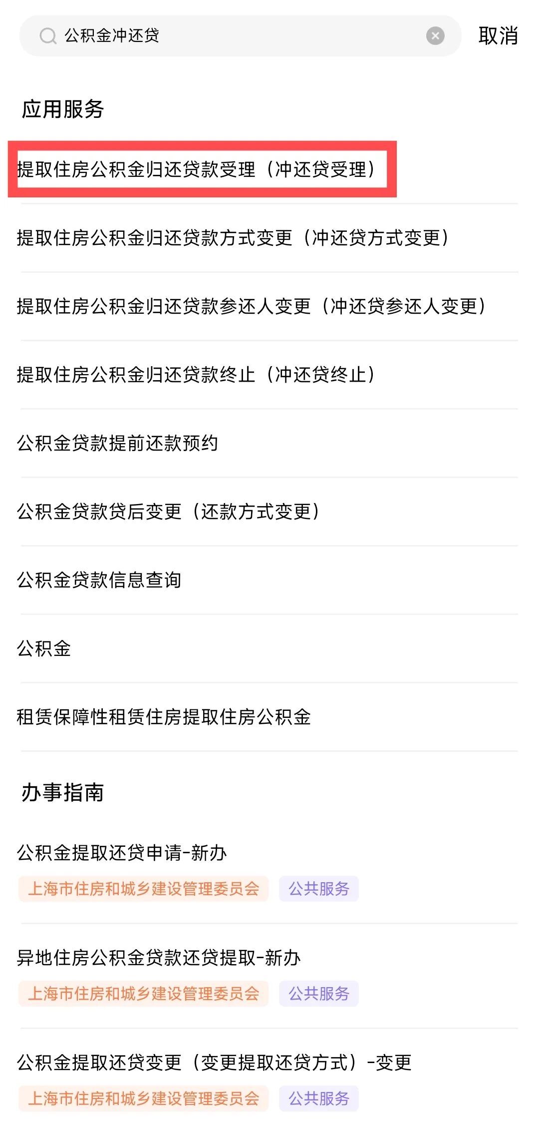 第一步:在首页搜索框中输入关键词“冲还贷”,找到提取住房公积金归还贷款受理(冲还贷受理)服务,点击进入。