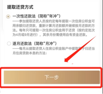 第四步:根据自身实际情况选择提取还款方式,选中“一次性还款法”或“逐月还款法”按钮后,选择“下一步”。