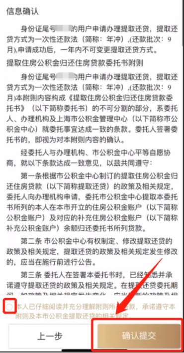第五步:再次确认信息,阅读并勾选同意《提取住房公积金归还住房贷款委托书附则》后,点击“确认提交”按钮,借款人即可完成申请提交。