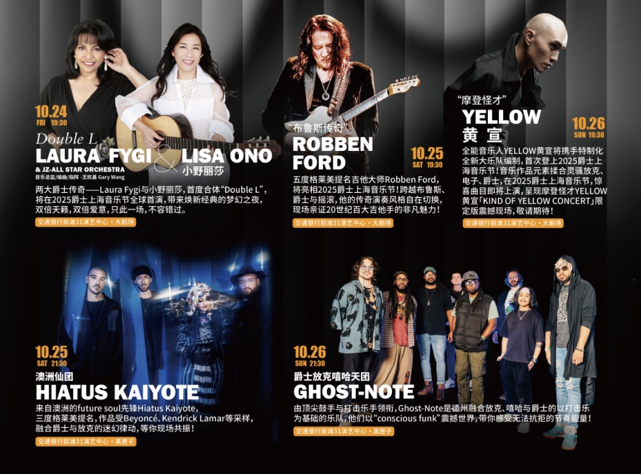室内演出迎来压轴盛宴。10月24日-26日,前滩31演艺中心连续三晚上演五场高水准演出。劳拉·菲姬与小野丽莎的首度携手被称作“世纪同框”,同期登场的还有多位重量级音乐人——“摩登怪才”YELLOW黄宣携特制大乐队呈现限定专场,澳大利亚仙团Hiatus Kaiyote带来中国内地首秀,布鲁斯传奇吉他大师Robben Ford演绎风格交汇的即兴火花,格莱美级鼓手领衔的德州爵士放克嘻哈天团Ghost-Note用强劲律动点燃夜晚。