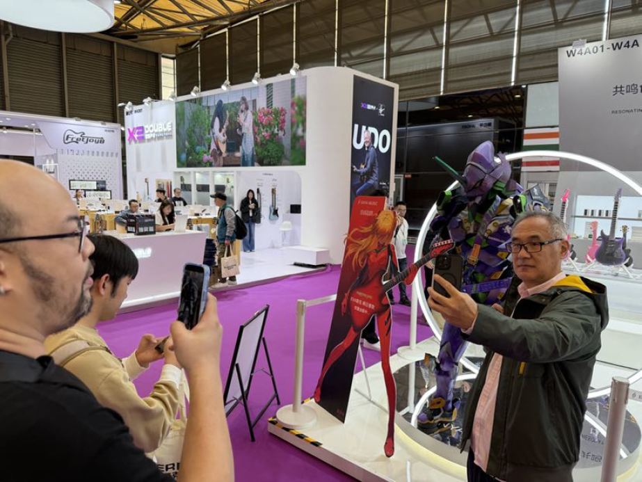 融入传统大漆工艺的敦煌牌蝶花并蒂古筝、Fender美产超极豪华复古系列电吉他、还有精准还原立体声场的卷积混响效果器、“全球三大专业耳机品牌”之一的德国拜雅带来的最新款无线耳机……展会上,全球品牌汇聚。