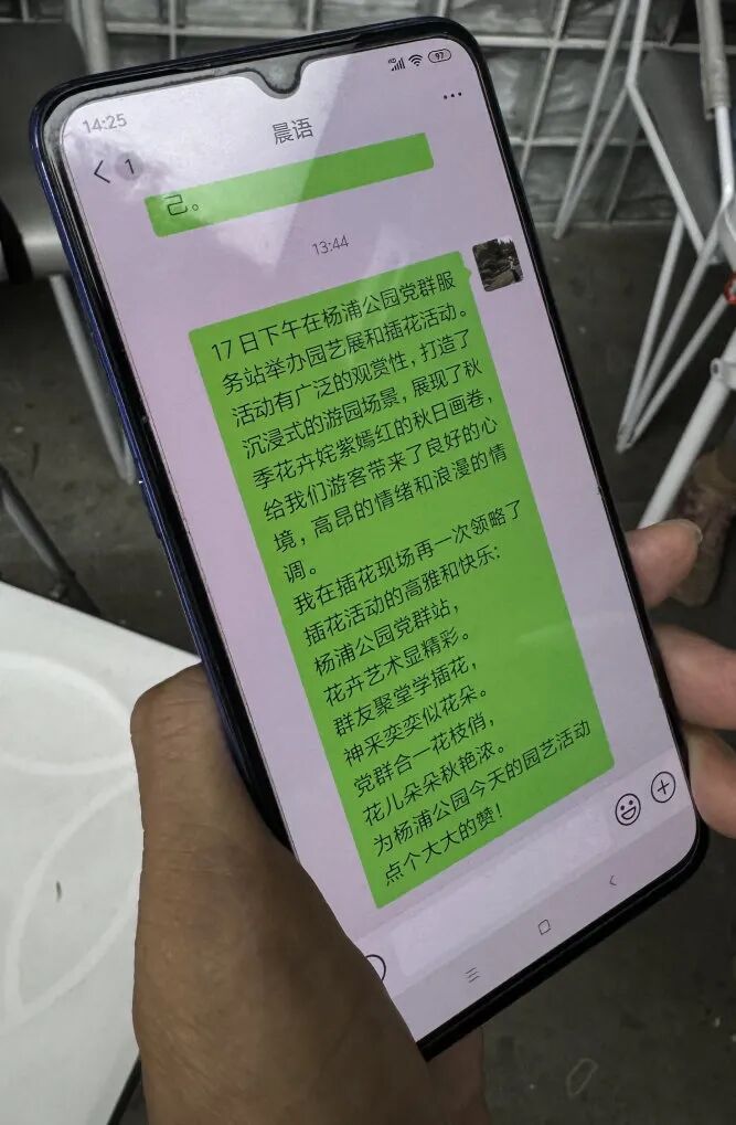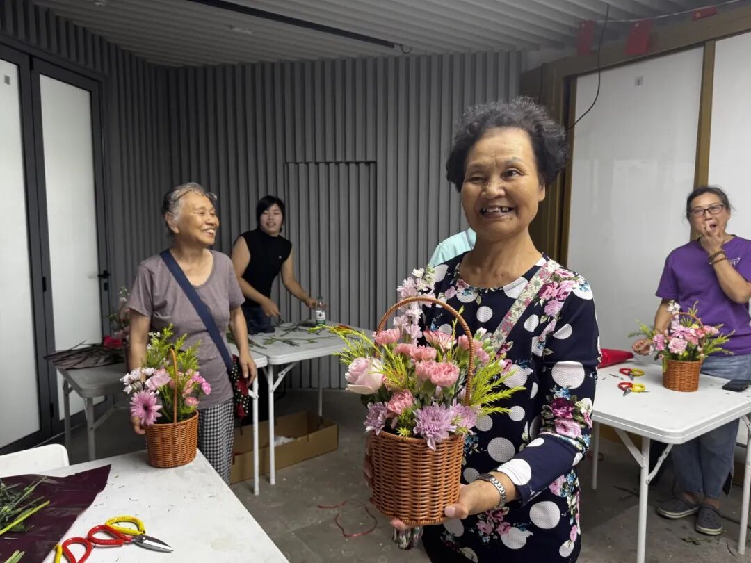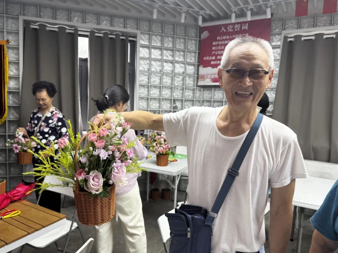 方阿姨更是有心,特地写了一首小诗,准备分享到朋友圈。她感慨道:“今天的插花活动非常高雅,让我感受到老有所乐、老有所为。”她的小诗这样写道:“杨浦公园党群站,花卉艺术显精彩。群友聚堂学插花,神采奕奕似花朵。党群合力花枝俏,花儿朵朵秋艳浓。”