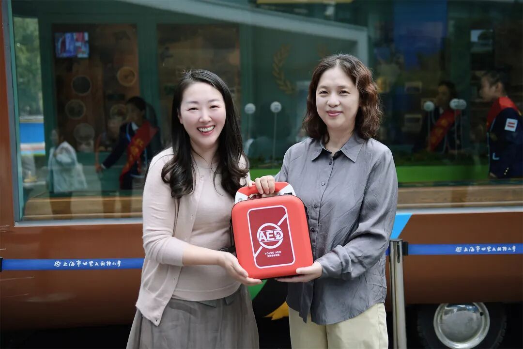 活动中,上海市体育宣传教育中心相关负责人将沃尔沃汽车提供的一台AED设备交付至上海市世外小学,为全校师生们的运动安全再次“添砖加瓦”。