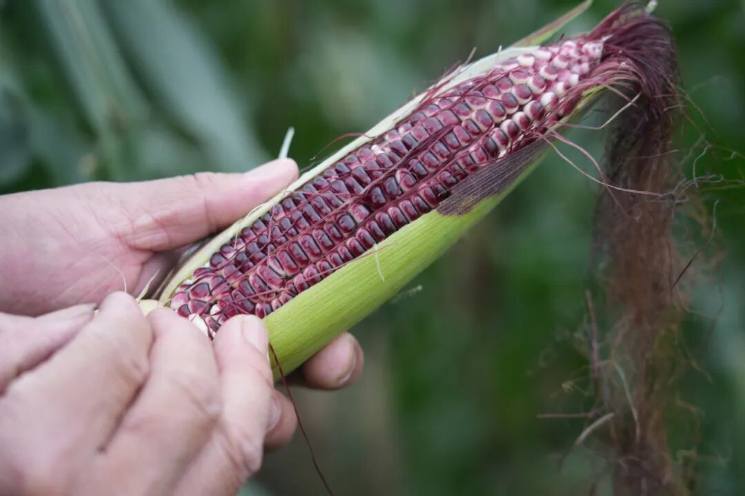 步入青村镇的上海贤瑞农产品产销专业合作社玉米种植基地,空气中弥漫着清新的植物清香。这份香气的来源,就藏在一穗穗饱满的玉米中——当你随手掰开一穗,只见紫黑色的玉米粒紧密排列,如同镶嵌在穗轴上的“紫宝石”,在秋日阳光下闪烁着独特的光泽。