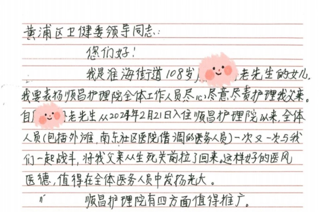 如今,屠老先生仍在二病区接受照料。晨间查房时的一声问候、用药时的反复叮嘱、康复训练中的全程陪伴,让医患关系升华为家人般的默契。这封七页长信不仅是对联合病房资源整合、高效协作的肯定,更印证了黄浦区顺昌医院“以患者为中心”的初心——通过跨机构协作,将三甲医院的技术实力与社区医疗的温情服务深度融合,为高龄、急危重症患者筑起生命防线。