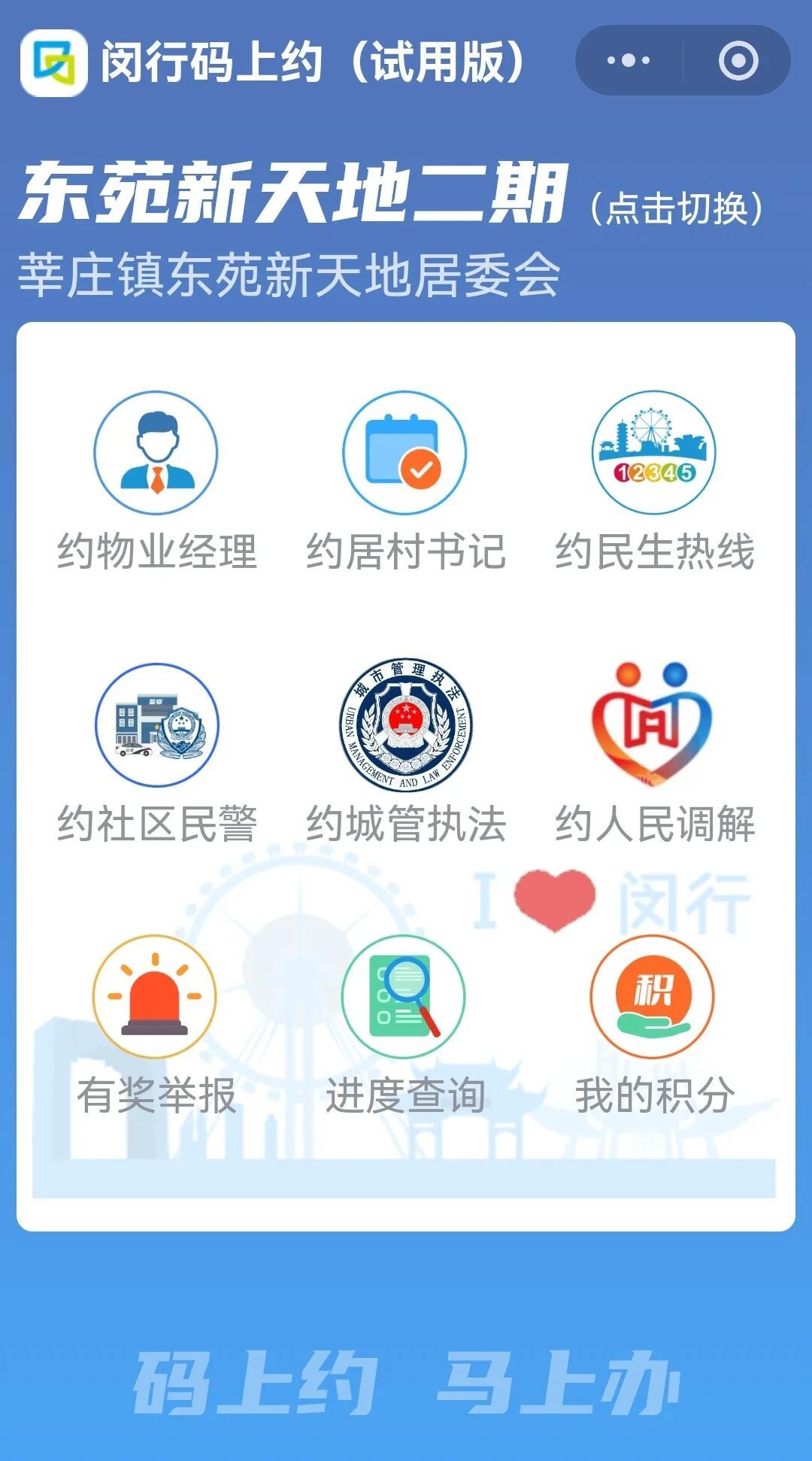 市民可以通过“码上约”向物业、居委、村委、城管、公安、民生热线反映闵行辖区内的非紧急类政务服务事项,如各类民生政策和公共信息咨询,涉及政府公共管理和公共服务的投诉请求,对本区经济发展、社会管理和城市建设等方面的意见建议,以及涉及安全生产问题的举报。
