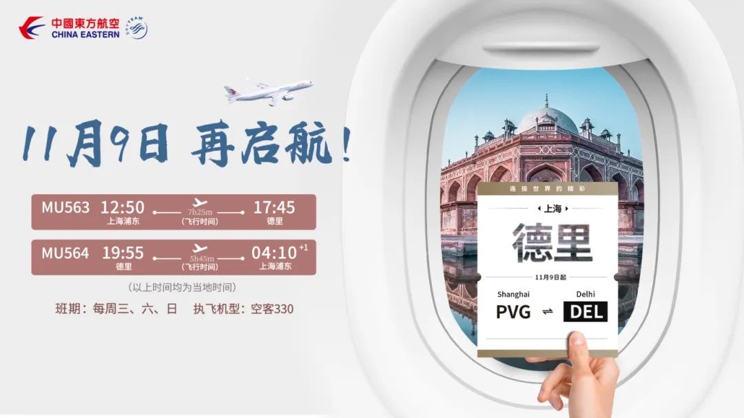 据中国东方航空公司消息,11月9日起,东航将开飞中国上海往返印度德里航线,由空客A330-200宽体客机执飞,每周三、六、日执行。去程航班号为MU563,12:50从上海浦东机场起飞,当地时间17:45抵达德里英迪拉·甘地国际机场;回程航班号为MU564,德里19:55起飞,次日04:10抵达上海浦东(以上时间均为当地时间)。目前,该航线的机票已开放销售。详见↓