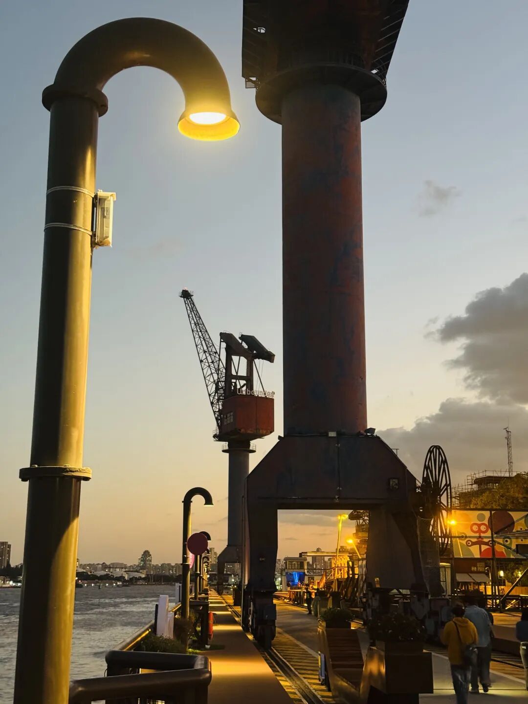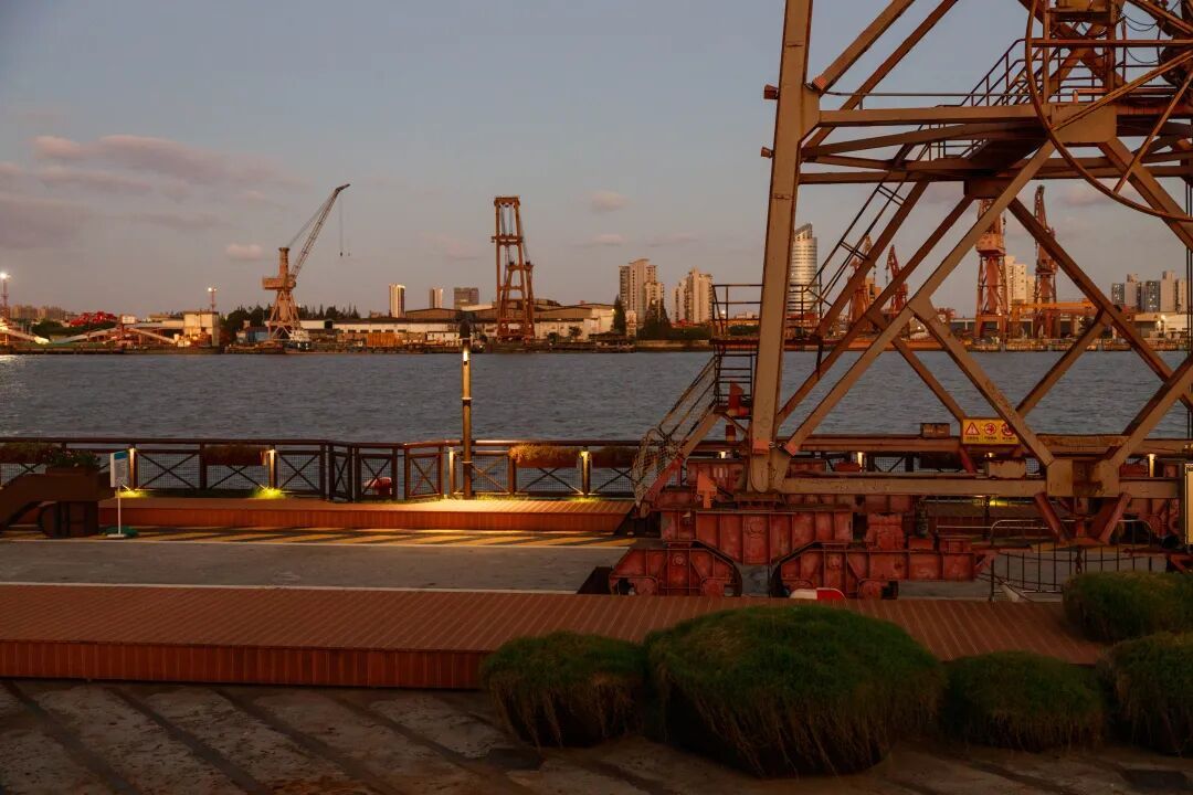夕阳下的复兴岛,工业遗存、艺术装置与城市天际线构成多层次的城市画卷。