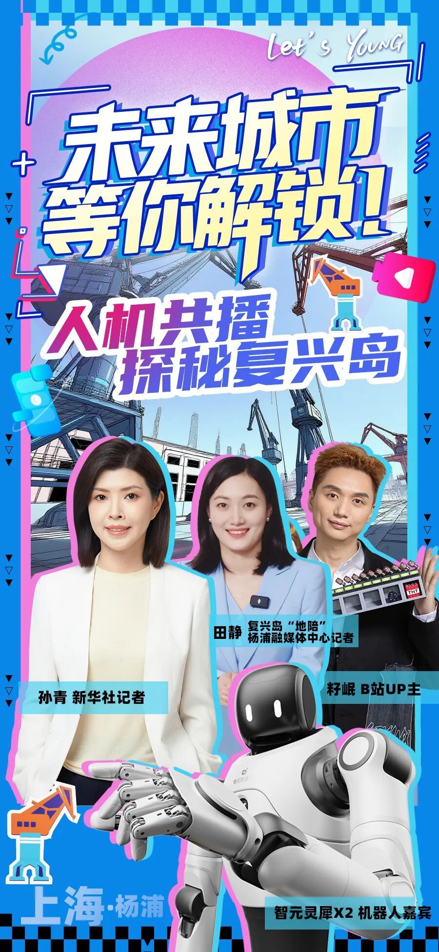 10月23日下午,由新华社记者孙青、杨浦区融媒体中心记者田静、B站百万粉丝UP主籽岷、机器人助播 “智元灵犀X2”组成的超强“探岛天团”,走进复兴岛,为大家开启一场“人机共播”的探岛之旅!一起来看看↓