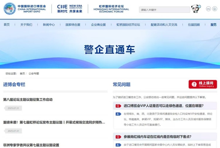 在中国国际进口博览会门户网站主页醒目位置设置“警企直通车”专栏飘窗。同步在市公安局门户网站开设“进博会警民警企沟通专栏” 。企业和群众可浏览警方发布的各项进博会便利化举措,查找历届常见问答,也可提问咨询。