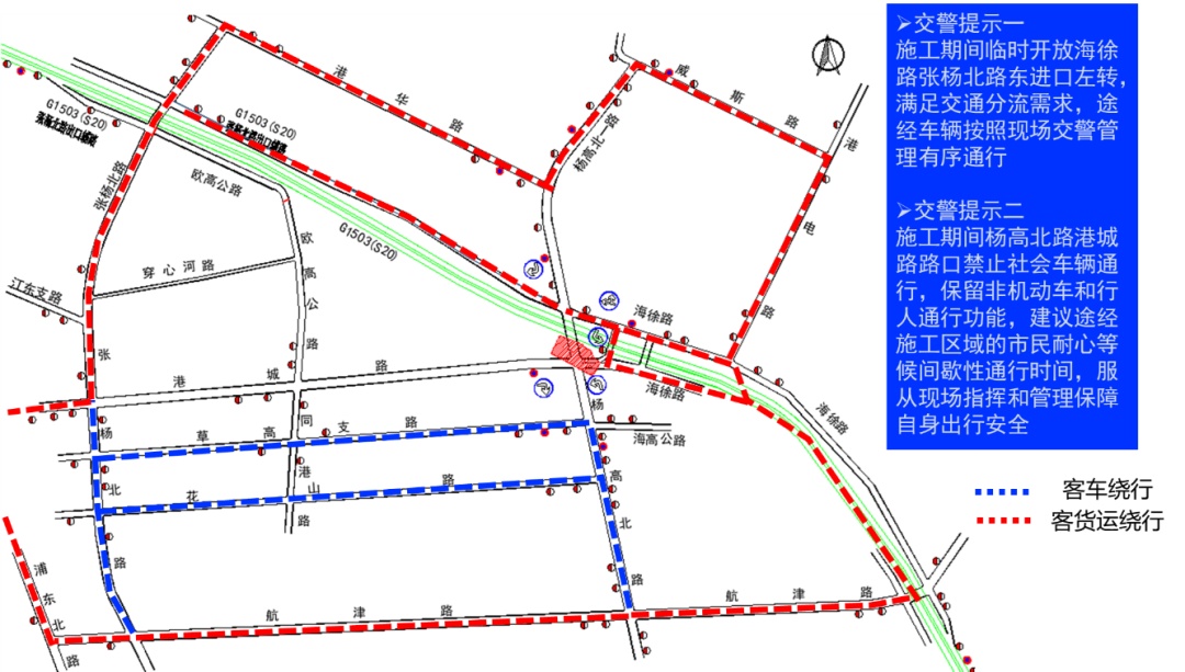 施工期间杨高北路/航津路、张杨北路/港城路等周边主要分流节点临时增加施工时段(21时—5时)禁止大型号牌客货运车辆通行的管理措施,建议大型号牌客货运车辆提前绕行;张杨北路/海徐路东进口临时开放东向南左转,增加绕行分流路径。
