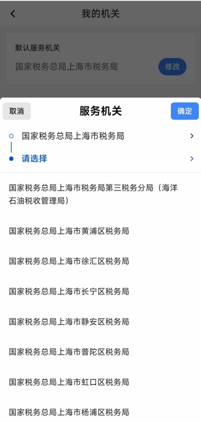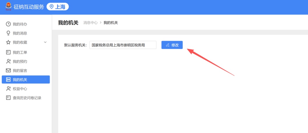 点击【修改】按钮,选择您需要互动的默认服务机关。