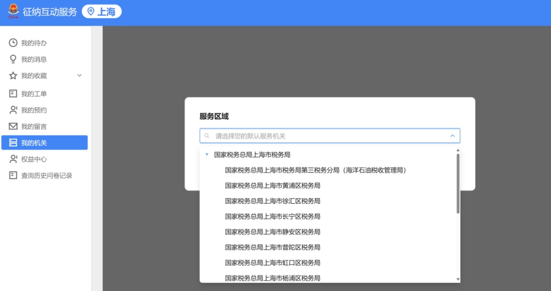 如果您是自然人,首次使用征纳互动人工服务时需选择默认服务机关,具体操作如下: