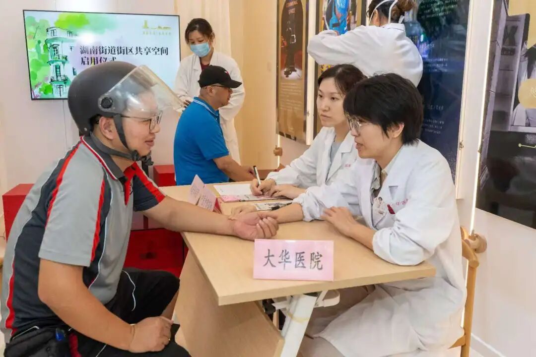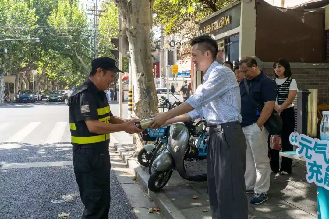 这场“元气充能”行动的背后,是湖南街道与永乐股份对“城市守护者”需求的精准洞察——他们工作强度大、时间紧张,长期的户外奔波更需健康关怀。武康安福风貌街区的Sunflour面包店、森态坊香薰店、fufuaura饰品店等十余家商铺也迅速响应,踊跃为活动捐赠饮料,不少店主还走上街头,为守护者们送上暖心物资。大华医院的医护人员也在共享空间设立“医路暖心”咨询台,用专业的医疗服务为“城市守护者们”筑起一道健康屏障。