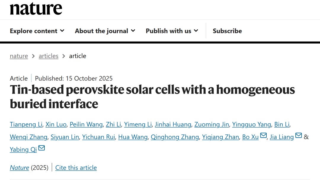 《基于均一埋底界面的锡基钙钛矿太阳能电池》(Tin-based perovskite solar cells with a homogeneous buried interface)为题