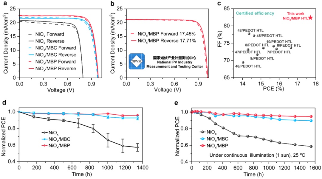 正是这一创新设计,实现了更高的载流子传输效率,最终研究团队制备的太阳能电池实现了世界纪录级光电转换效率。在稳定性方面,由于摆脱了PEDOT:PSS空穴传输层材料,电池的稳定性也实现了质的飞跃。实验表明,封装后的器件在连续运行数月后,性能几乎保持不变,解决了该领域最棘手的不稳定难题。