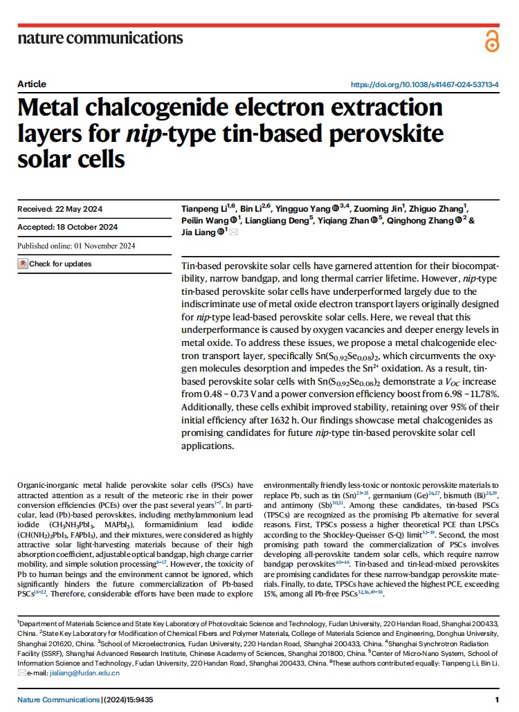 团队此前关于金属氧化物功能层的研究发表于2024年的Nature Communications上,文中提出了一种新型金属硫族化物功能层材料,改善了金属氧化物功能层表面氧空位诱导锡基钙钛矿材料分解的问题,这为他们制备出更高效率的太阳能电池提供了理论基础。