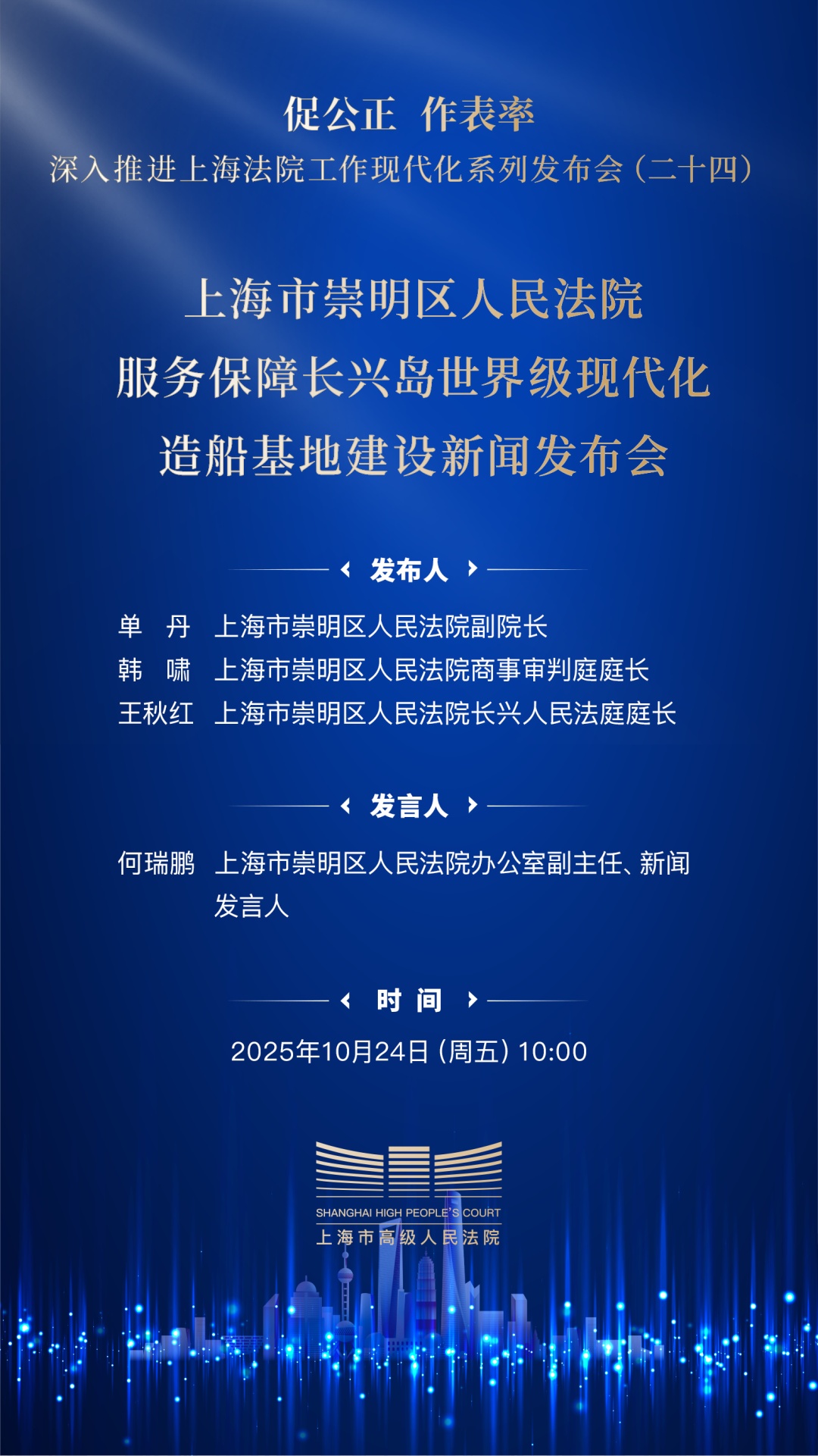 为深入贯彻落实国家关于制造强国、海洋强国的战略部署,更有力地护航长兴岛世界级现代化造船基地建设,今天(10月24日)上午,上海市崇明区人民法院(以下简称崇明区人民法院)召开新闻发布会,通报服务保障长兴岛世界级现代化造船基地建设总体情况和典型案例。