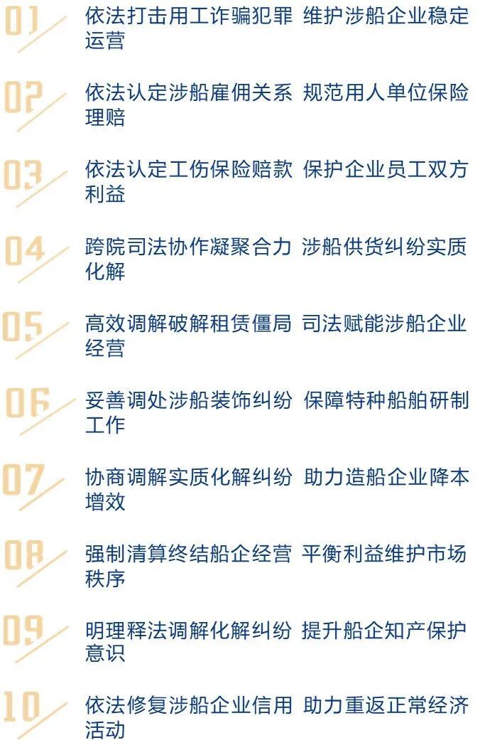 一是精准司法护航,维护产业发展。重拳打击诈骗等侵害船舶产业链安全的犯罪行为,守护产业安全。坚持调解优先、调判结合,创新“跨院联动+一揽子解纷”机制,高效化解矛盾纠纷。深化府院联动,推动“僵尸企业”有序退出市场,促进市场活跃度,释放发展新动能。