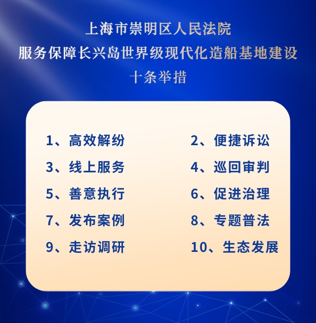 长兴岛船舶与海洋工程装备产业发展,是崇明世界级生态岛建设发展大局的重要组成部分。近年来,崇明区人民法院聚焦长兴产业发展特点和需求,持续深化法治化营商环境建设,充分发挥司法职能作用,努力为长兴岛船舶与海洋装备产业发展提供有力的司法支撑和服务。