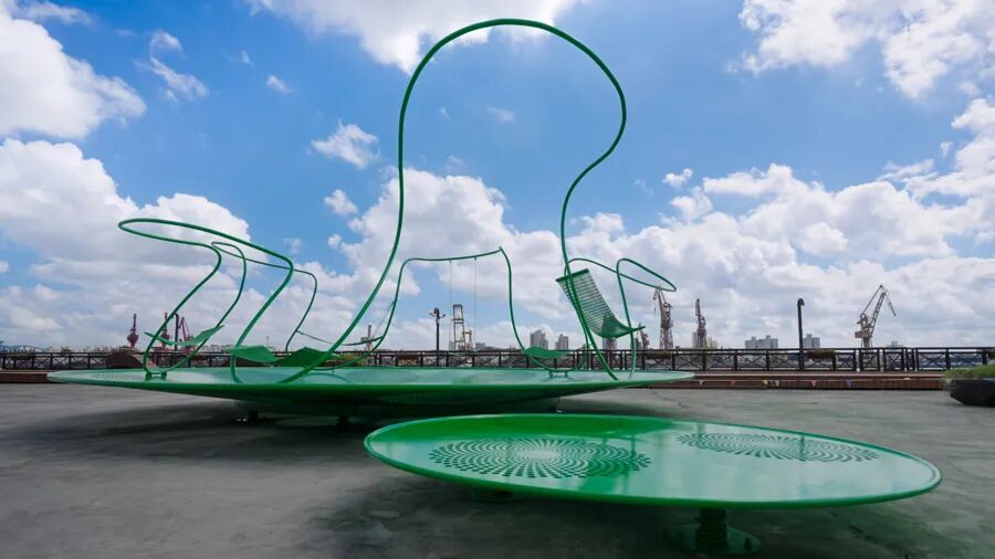 在滨江步道区,一个时刻在运动着的大圆盘形钢结构互动装置由秋千和异形座椅组成,瞬间就可以“吸”娃无数,也让陪伴或路过的大人秒回童年……
