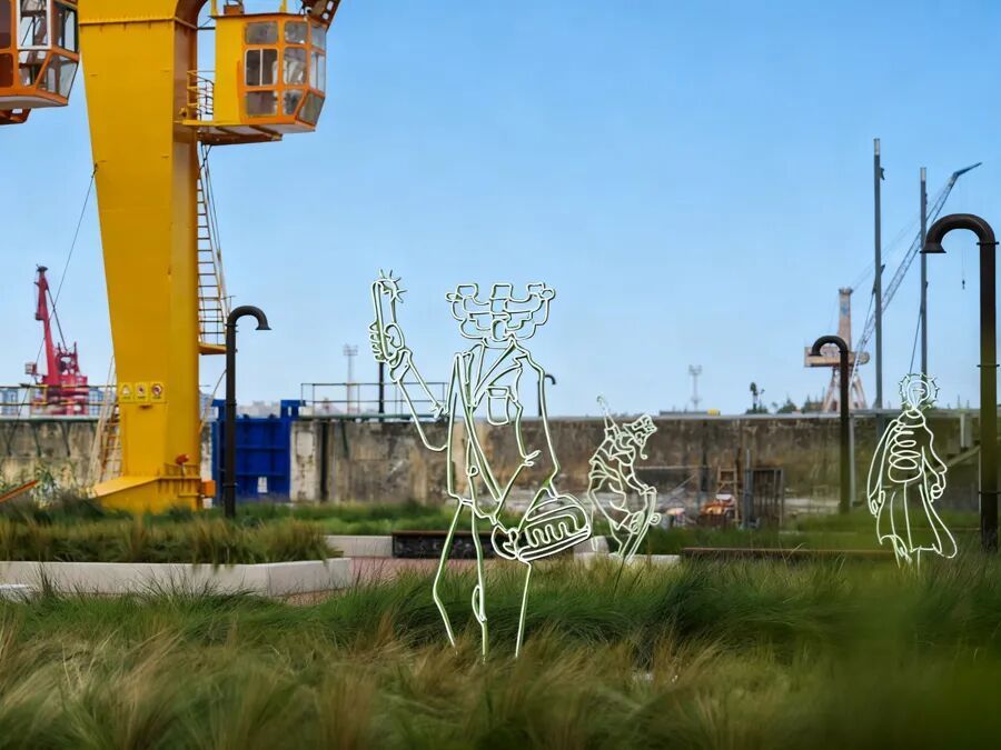 据说,作为百年船厂的工业遗存,这三座巨型塔吊已在此沉寂多年。但在下方猫咪的“遥控”之下,它们仿佛重新工作了起来。为迎接空间艺术季而点缀在底座上的装饰图案,则让塔吊看上去“青春”了不少。鲜活的时尚感让巨型塔吊不再令人望而生畏。