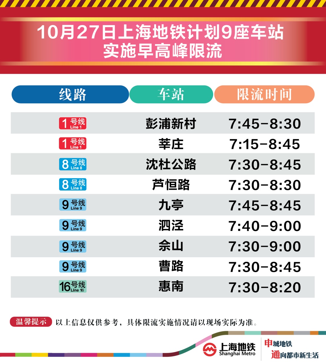 10月27日早高峰彭浦新村、莘庄等9座地铁站计划限流