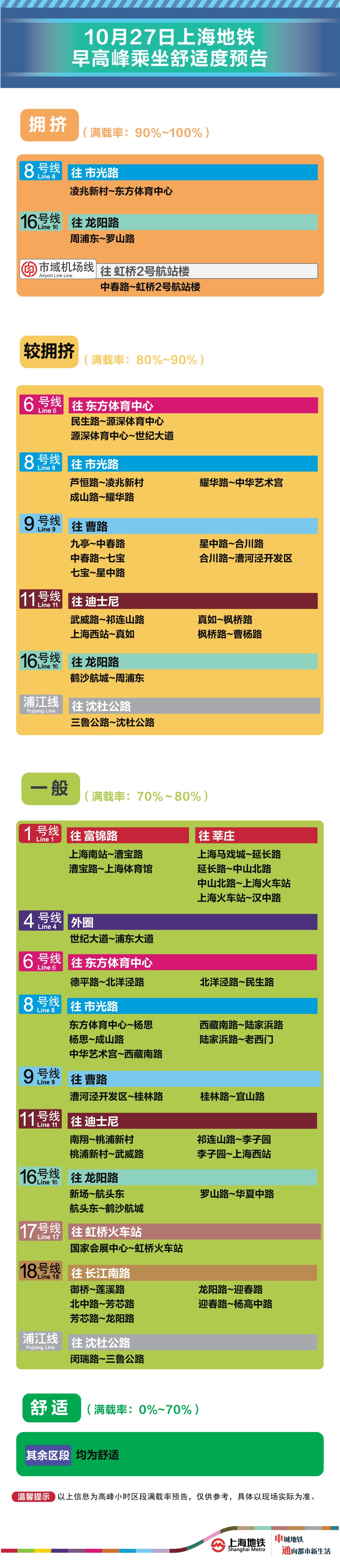 为提升上海地铁早高峰期间出行服务水平,提升乘客乘坐体验,上海地铁向乘客提供乘坐舒适度预告,方便乘客提