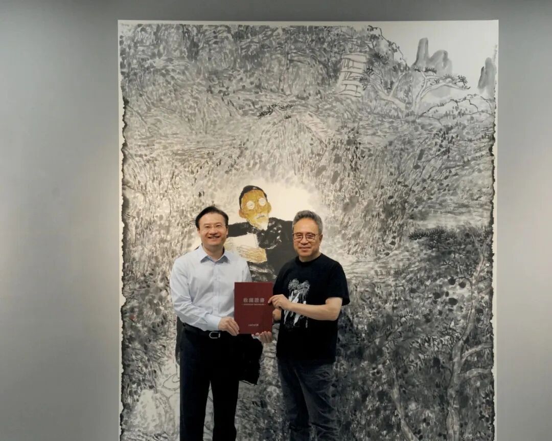 为庆祝上海中国画院成立65周年,袁武特意创作了一幅260cm×230cm的大尺幅作品《宾虹写生图》,并在展览现场捐赠给上海中国画院。上海中国画院党总支书记兼主持工作副院长江鹏为其颁发了作品收藏证书。江鹏表示,上海中国画院作为新中国最早成立的画院之一,始终以传承弘扬中国书画艺术、培养优秀艺术人才为己任,此次展览既是对袁武艺术成就的集中呈现,也是画院依托“一院两馆”独特架构,搭建南北艺术交流桥梁的重要实践。