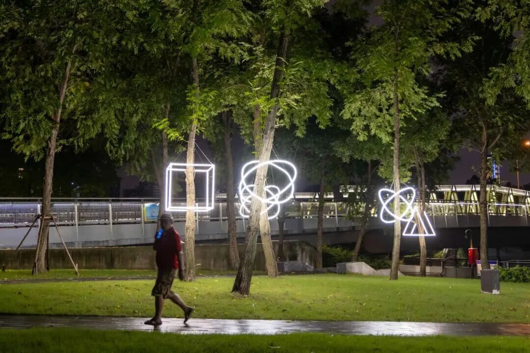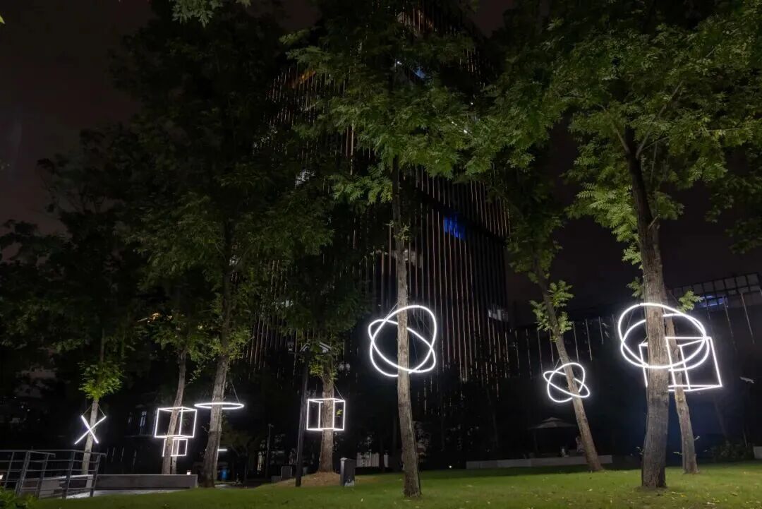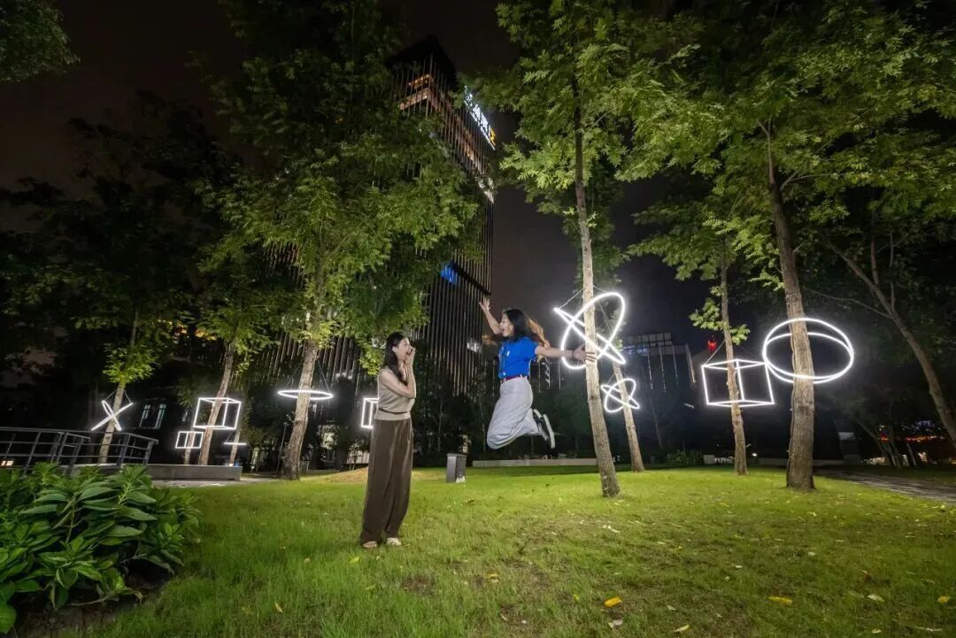 当日落时分收起最后一缕霞光,请移步至秀带广场观景区域。这里正上演一场光与空间的对话——全新引入的立体光柱照明设计,将12套造型各异的图形装置通过钢丝绳巧妙吊挂于12棵树上,犹如星河洒落的几何琴键,在这片承载工业记忆的滨水空间奏响光影交响曲。