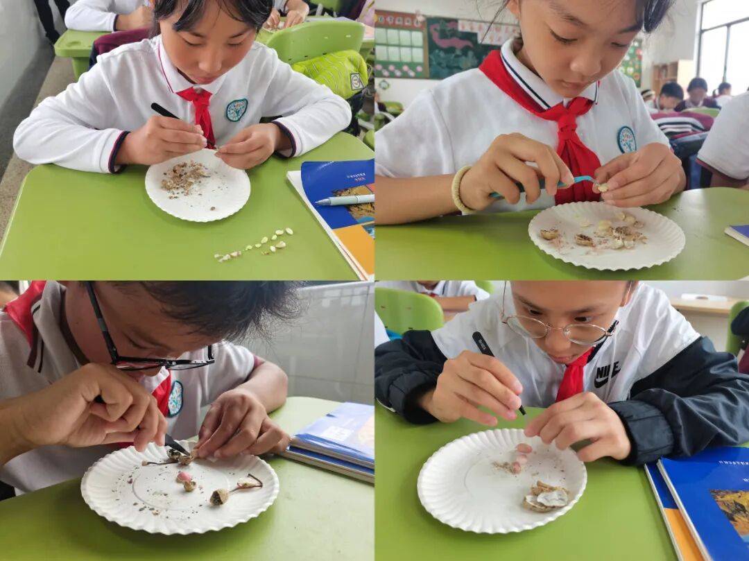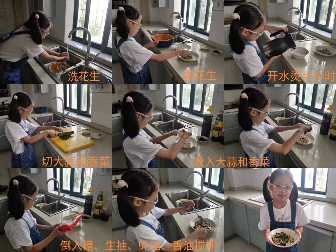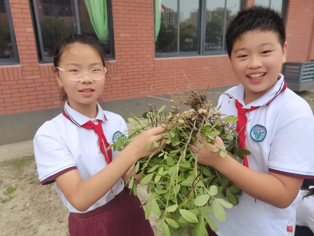 以花生种植为例,课程引导学生从科学观察起步,结合农场这一空间的实际情况,仔细审视花生荚果的形态、颜色等生物学特征。在认识到果壳常被废弃后,一个驱动性问题自然产生:“能否将花生壳变废为宝?”这促使项目从单纯的种植劳动,转向了一场融合科学探究与艺术创造的跨学科旅程。学生们对花生壳进行分类、设计,通过绘画、上色与拼贴,将自然之物转化为新颖灵动的艺术作品。充满创意、栩栩如生的花生壳作品诞生了!课程的边界随之延伸至家庭。以“花生可以做成哪些美食?”为新的驱动性问题,学生在家中经历剥、洗、烹煮花生的全过程。在这个项目中,学生经历了从科学观察、提出问题,到艺术创造,再到生活应用的完整闭环。