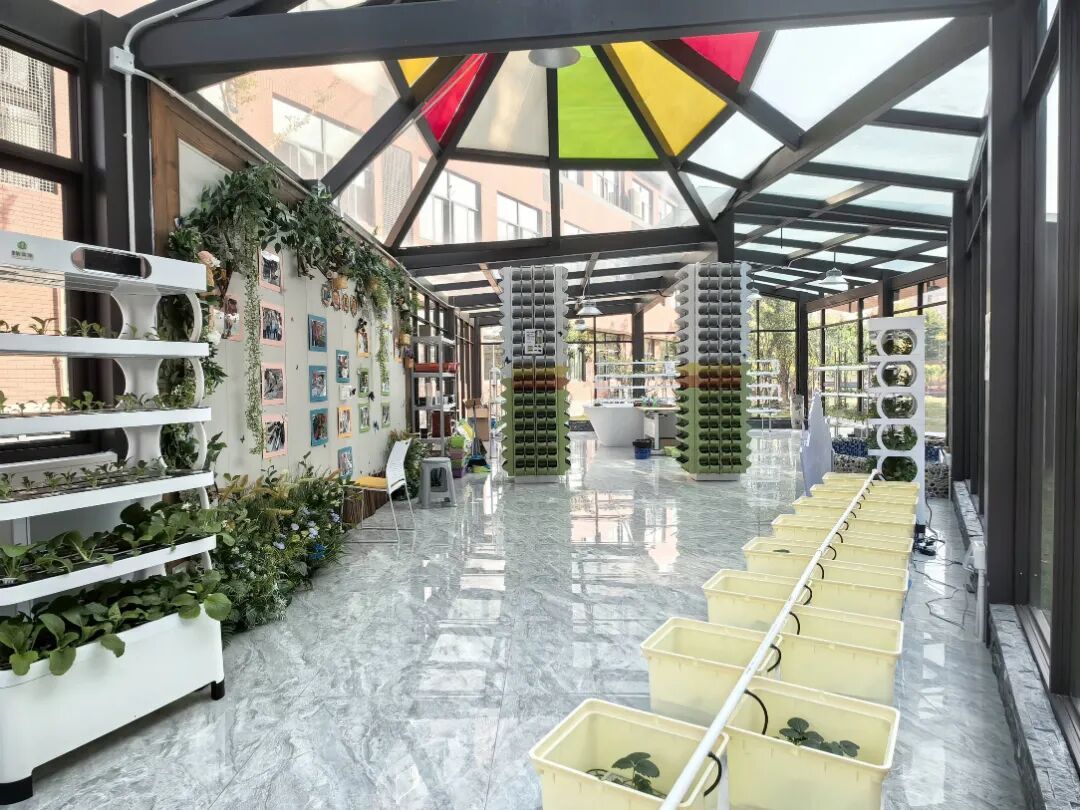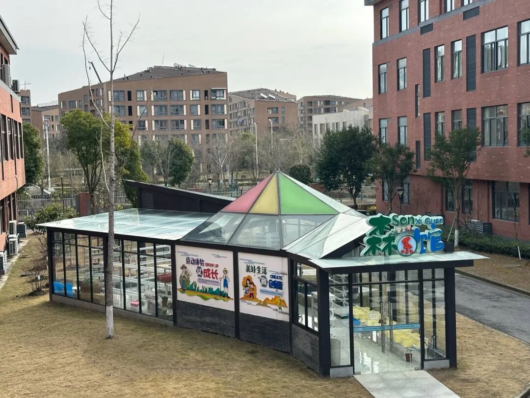 佘外实验学校位于佘山脚下,依托地质资源,因地制宜,打造了小学部面积600㎡、中学部205㎡的“快乐农场”农耕学习空间,并在“快乐农场”实现了“一班一田”全覆盖的传统种植。同时,学校积极探索新型育人模式,进一步拓展学习空间,在原有“快乐农场”基础上推进建设新型阳光房——“森系馆”。“森系馆”为占地面积106㎡的玻璃阳光房,室内按照功能分为实验区、展览区和学习区三部分。