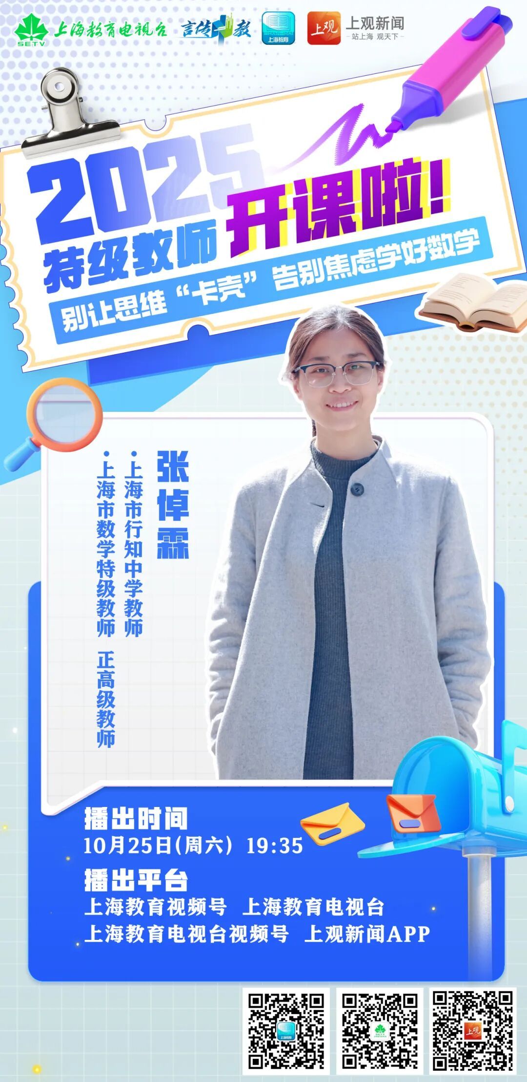 10月25日(周六)19:35,2025年“特级教师开课啦”将在上海教育视频号、上海教育电视台、上海教育电视台视频号、上观APP同步播出第二期。上海市行知中学教师、上海市数学特级教师张倬霖带来的讲座主题是“别让思维‘卡壳’,告别焦虑学好数学”。