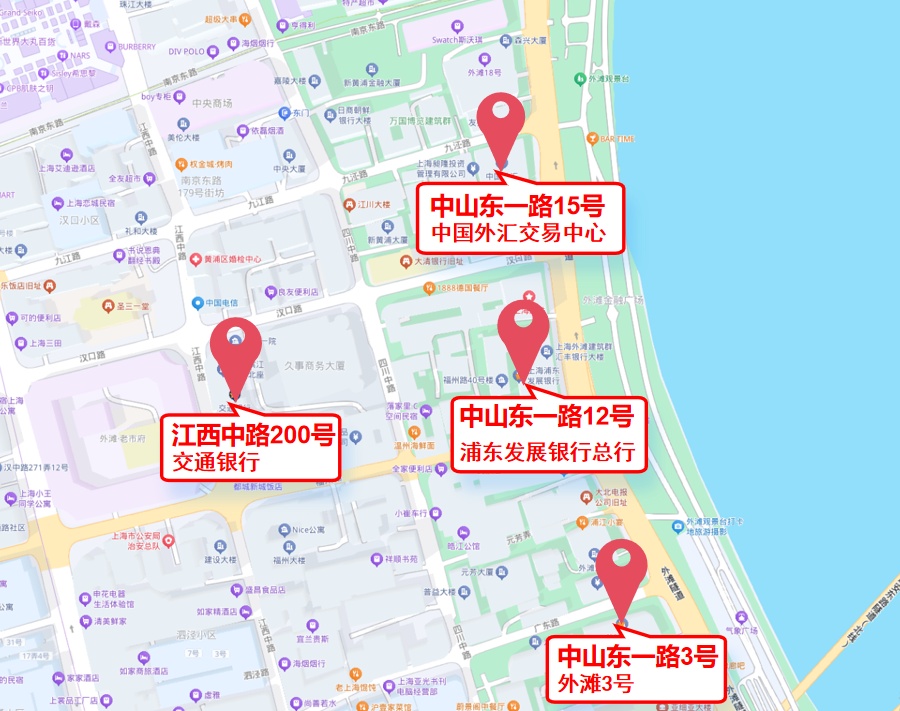 中国外汇交易中心(原华俄道胜银行大楼)位于中山东一路15号,是中国金融史上第一家中外合资银行,由德国建筑师海因里希·倍高设计,1902年落成,是上海早期新古典主义建筑的代表作。