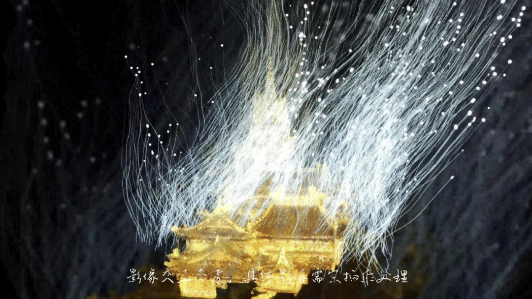 作品将静安市北工业遗产与未来科创场域结合,背景影像由老工厂逐渐转化为数字化科创景观。