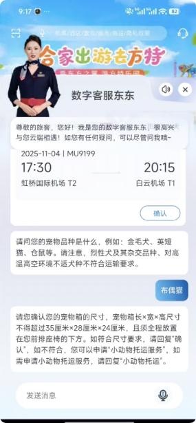 新增数字人与快速预订机票流程、实现行程规划、智能问答交互体验的整合,目前正在对带宠物进客舱、无成人陪伴儿童、轮椅旅客、小动物运输、退票进度查询等7个场景进行联调测试。