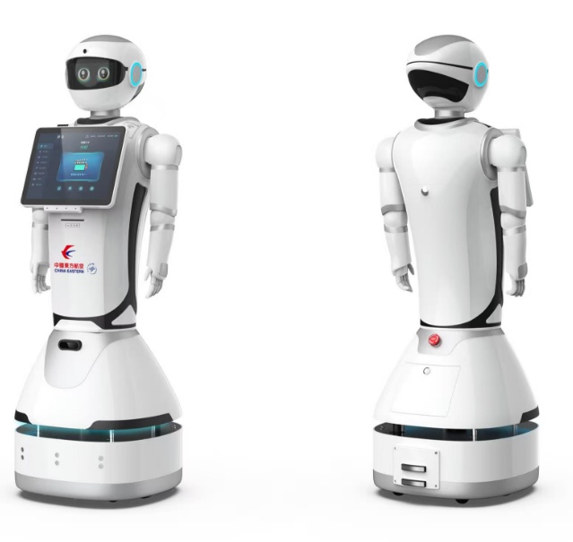 东航服务机器人基于东航自有大模型、知识库和集成一体的证件识别、二维码扫描等硬件功能,对接集成值机系统等内部业务系统,用于航站楼值机、行李查询等区域为旅客提供智能问答查询和值机、改签升舱等业务服务。