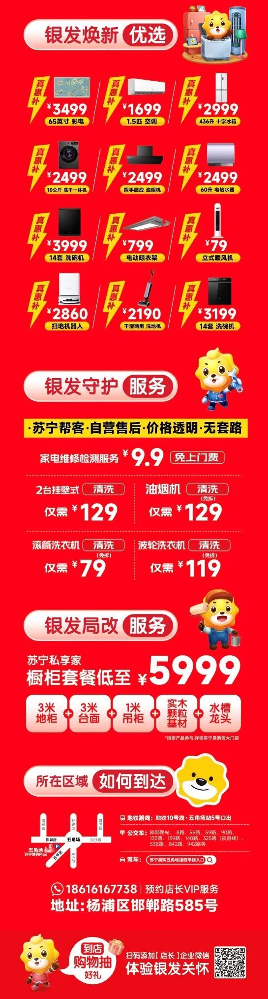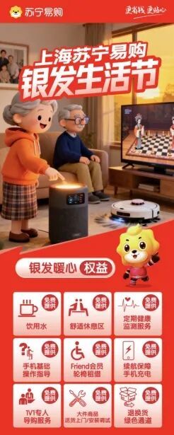 五角场苏宁易购超级体验店结合银发需求,精选一系列适老化产品开展主题优惠活动,丰富老年顾客的消费选择和生活体验。精选创维、倍科、法迪欧、美菱、老板、卡萨帝等品牌推出特惠福利;海尔品牌买赠活动,购买海尔全品类套餐达到指定金额,可获赠血压仪、智能马桶盖或按摩沙发等适老化产品。同时,门店秉承“服务至上,顾客为本”的理念,定期开展免费测量血压血糖服务、“银发手机课堂”、Friend会员免费轮椅租借等多项免费便民服务。为确保老年顾客的购物过程顺畅无忧,还特别推出“银发专人导购”服务、“银发绿色退换货通道”,为老年人提供更便捷、更舒适、更安全的消费环境和生活支持。