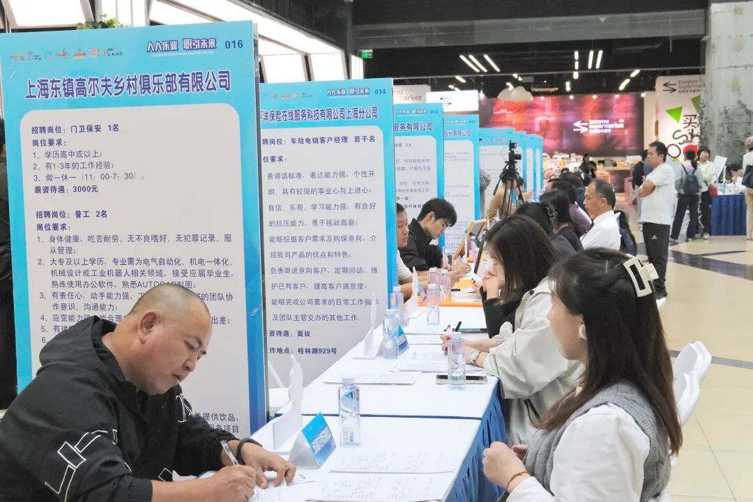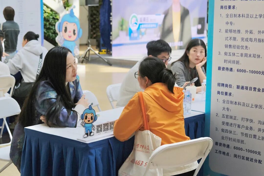 10月24日下午,“人人乐业 职引未来”——上海虹桥枢纽乐业空间专场招聘会暨迎进博就业服务活动在虹桥天地中庭举行。活动现场设置了招聘服务专区、长三角就业服务专区和新业态用工专区,近60家企业报名参与,提供超500个岗位,吸引了诸多求职者前来投递简历。