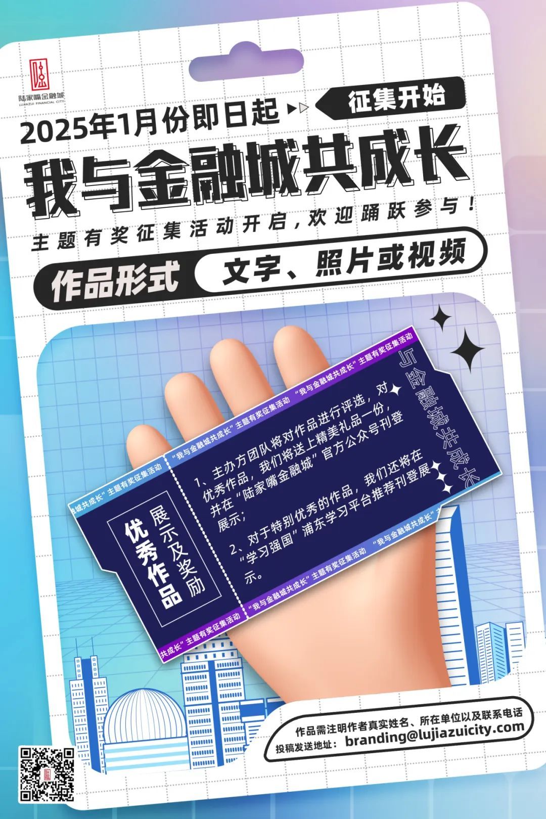 本次征集主题为“我与金融城共成长”,内容包括但不仅限于讲述您在陆家嘴成长、拼搏和奋斗的生动故事;介绍陆家嘴金融城的美景、美食,赏一出景、探一家店、品一道菜;也可以分享您在陆家嘴经历的好人好事,发现的美好惊喜等等。旨在通过作品,展现陆家嘴金融城生机勃勃、宜居宜业的城市风貌。