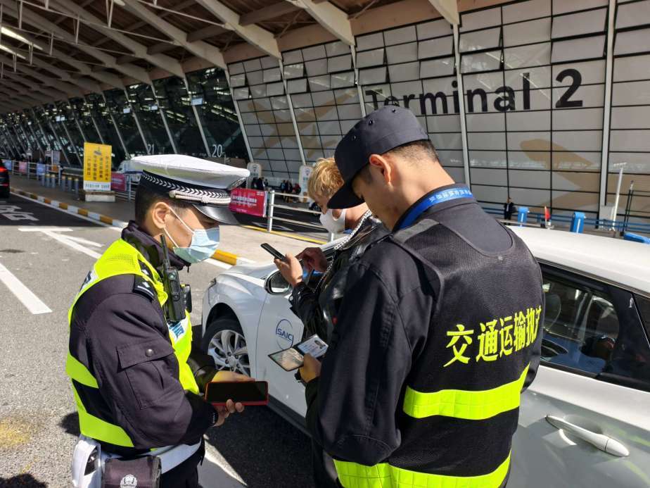 在浦东机场、上海火车站、地铁车站等交通枢纽,执法人员依法查处网约车非法客运及易致祸道路交通违法行为,提高网约车服务质量,保障乘客合法权益,为进博会召开创造良好的出行环境。