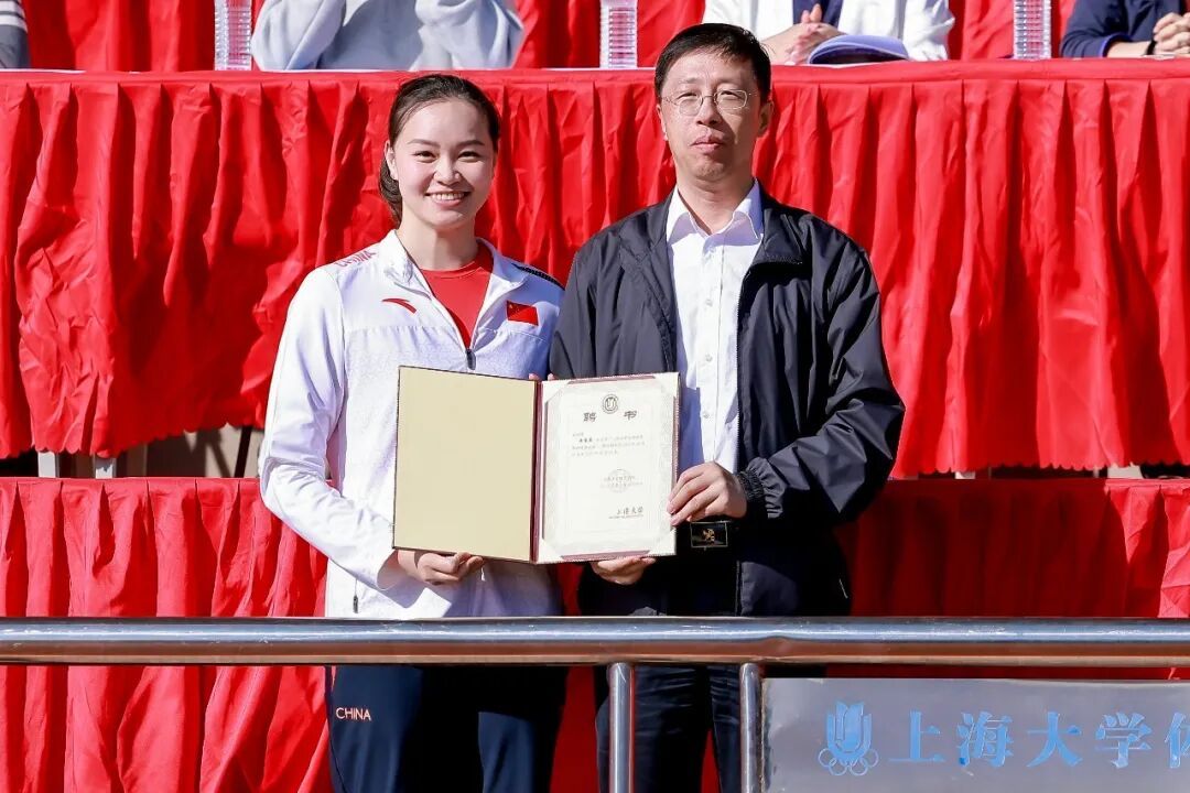 校党委书记吴坚勇为黄雪辰颁发“上海大学校园体育精神传播大使”证书。
