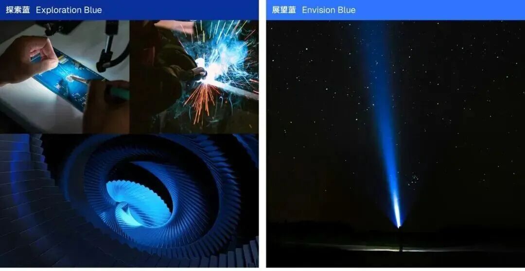 新的色彩系统延续了原有蓝色谱系。一深一浅的“探索蓝”与“展望蓝”,兼具科技理性与青春气质,象征智慧、开放与未来,奠定了更具视觉张力的主色调。搭配红、橙、绿、紫的辅助色,构建出灵活且统一的色彩体系,适配不同传播场景。