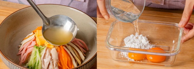 5.将料汁倒入汤盆,打蛋取蛋黄,加入淀粉和水搅匀,装入保鲜袋扎紧。