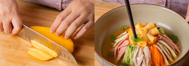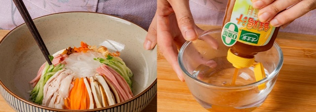 4.根据个人喜好,按顺序把食材摆放在汤盆中,在适量开水内加入鲜鸡汁调味料搅拌均匀制作料汁。