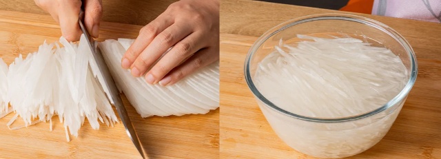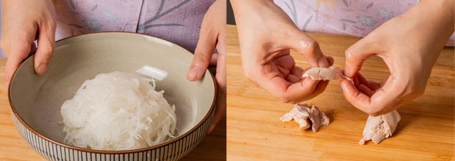 1.将白萝卜洗净切成细丝,放入清水中浸泡约30分钟,并将鸡腿肉同步蒸熟。